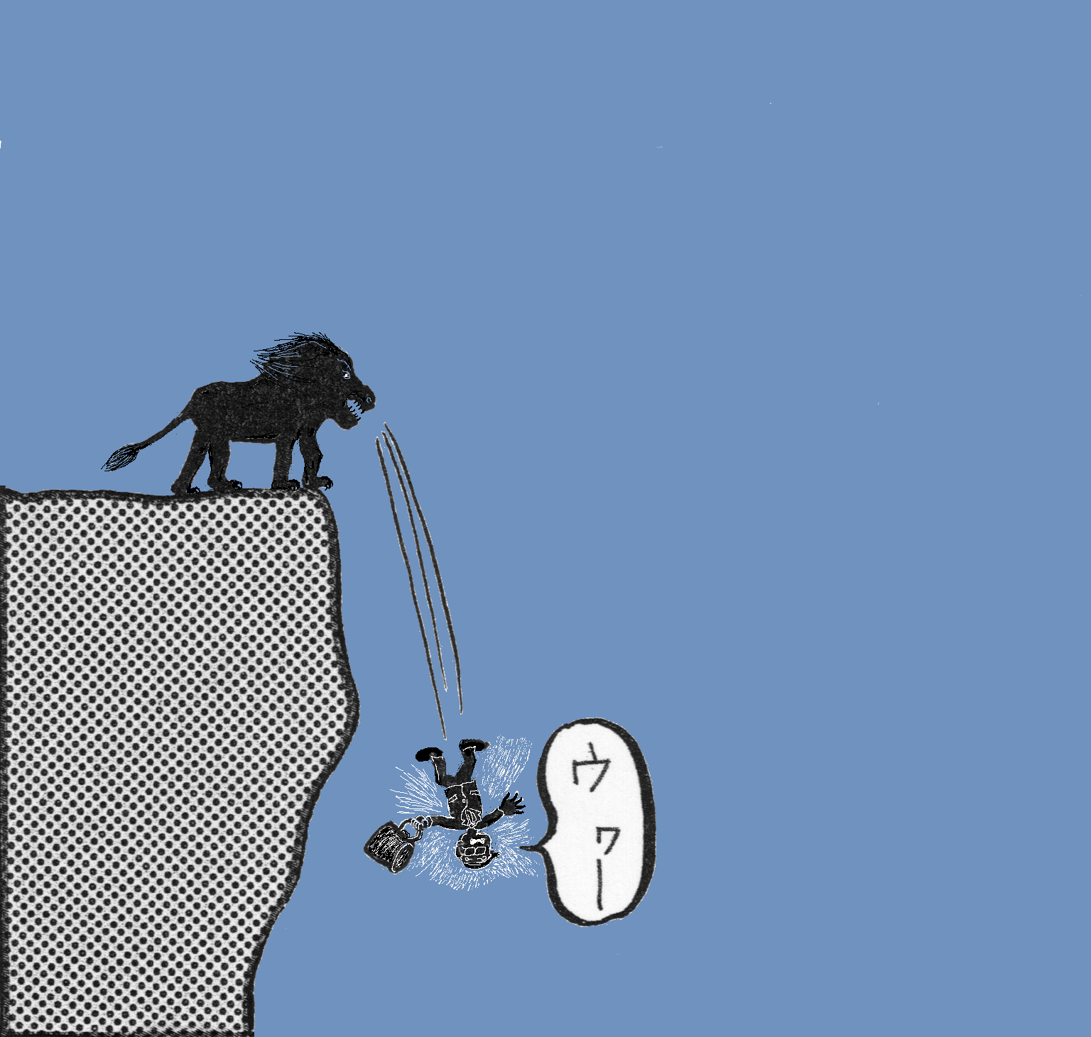 例えば、パパをライオンのタマちゃんが、鍛えるために谷底に落とすスタンプがあります。『出直して来い』とか『一昨日来やがれ』って字をいれるのですが、原画に手を加えてあります。こんな感じ。